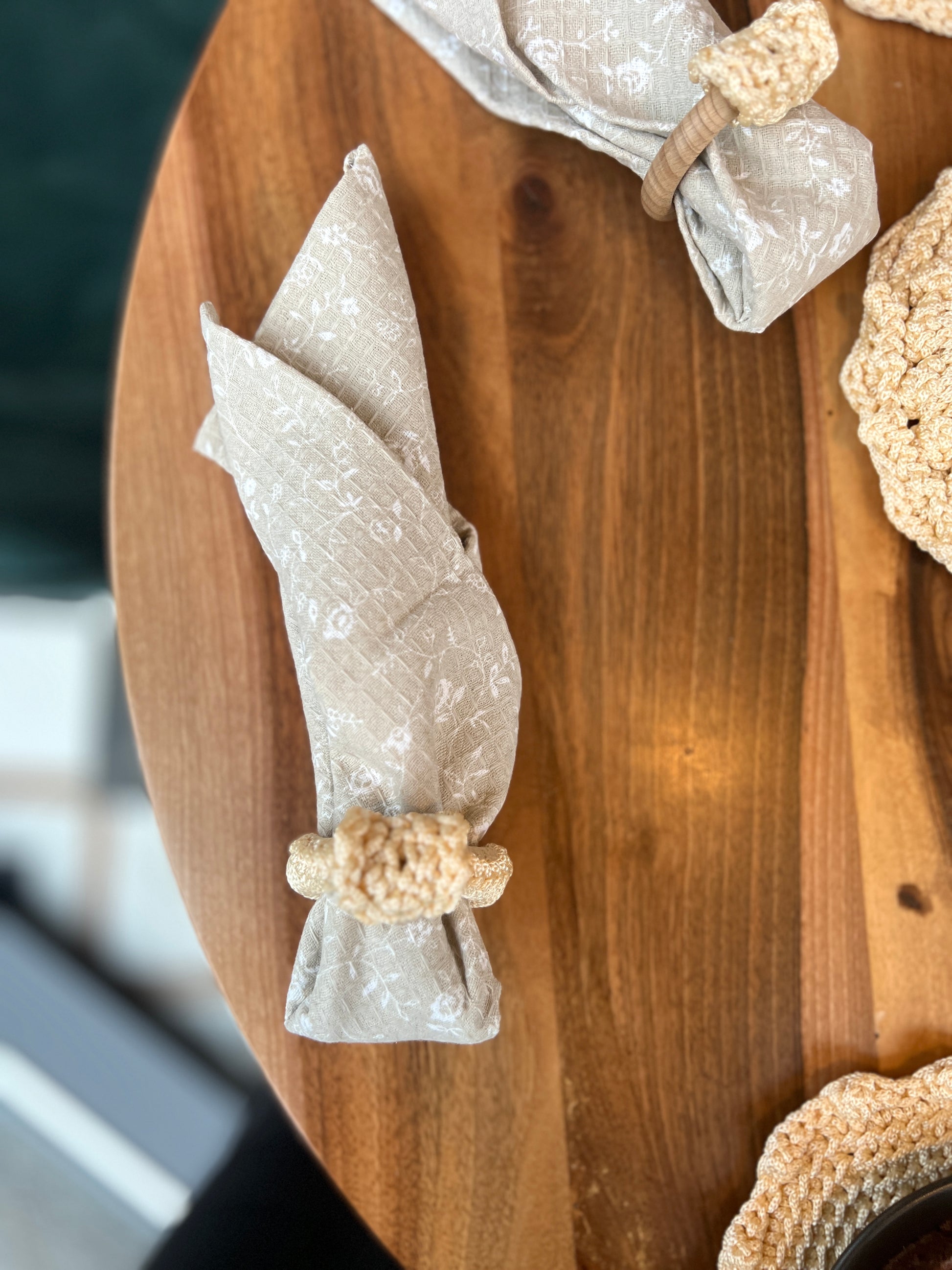 Wooden napkin rings with crocheted decorative elements are a stylish accent for table settings. They harmoniously combine natural materials and handcraft, adding a special charm to your table.