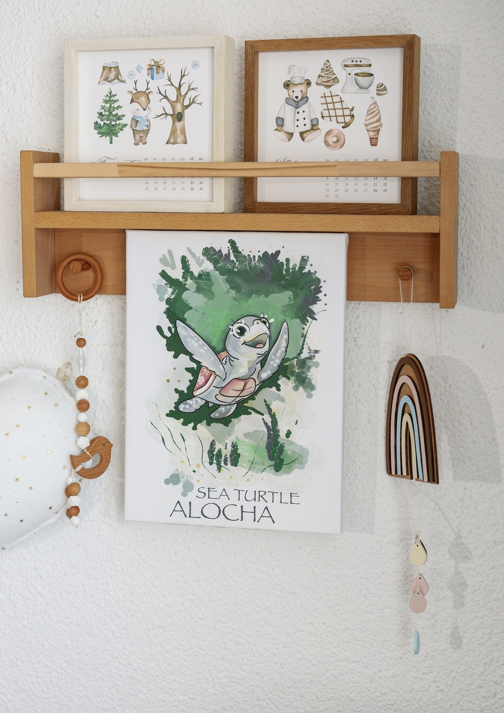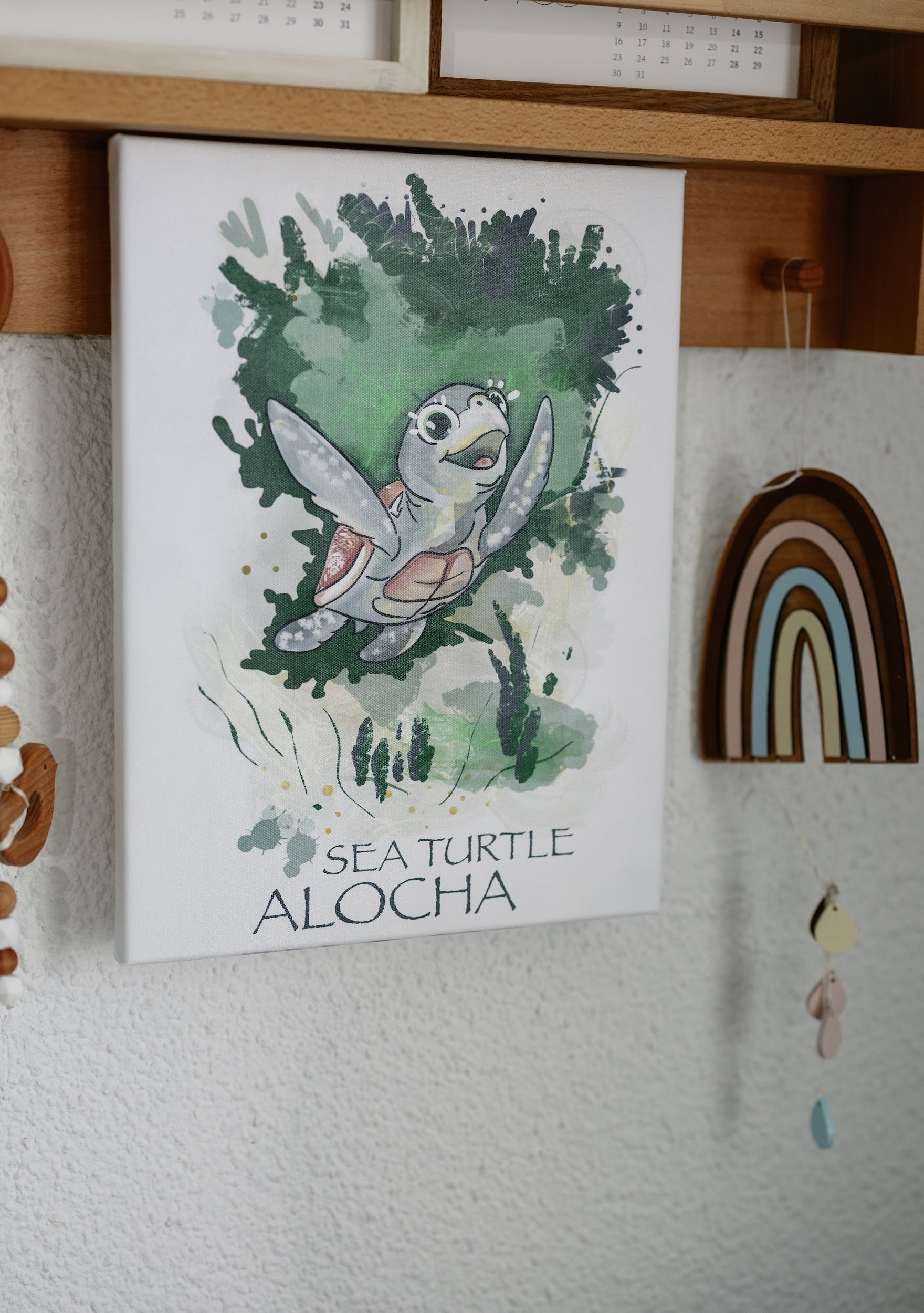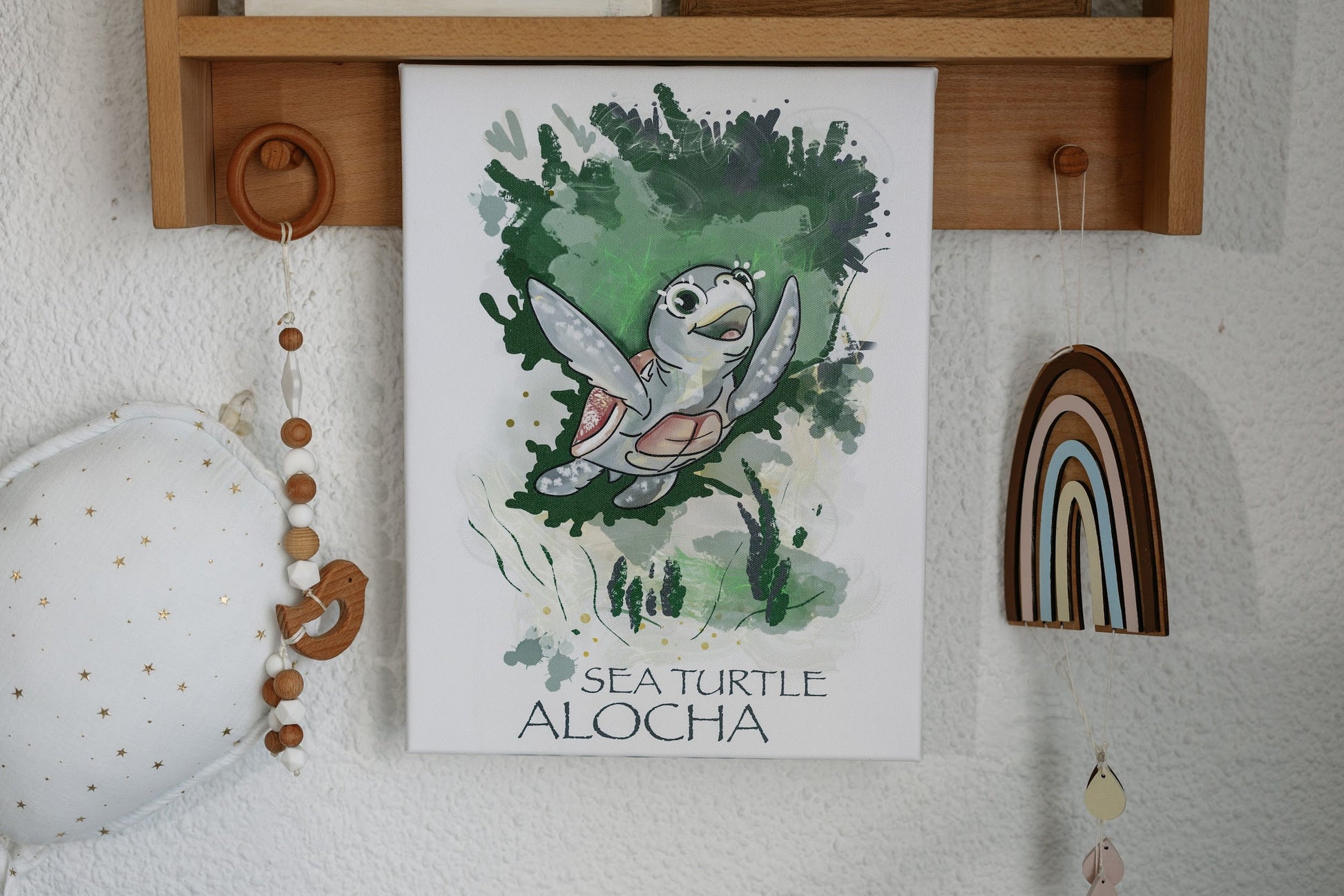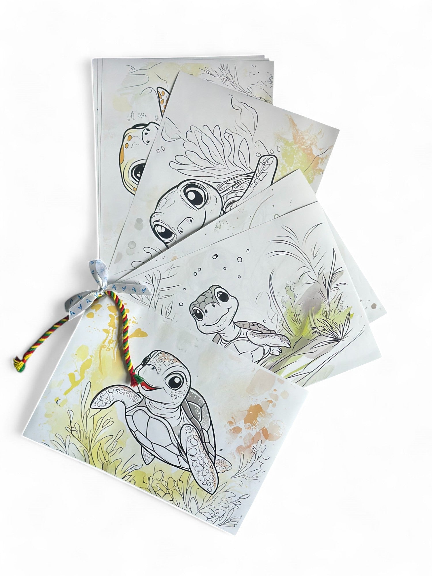 The set includes an original painting with the turtle on canvas and a coloring page, giving the child the opportunity to create and develop imagination. The turtle shares her preferences and tells her story.